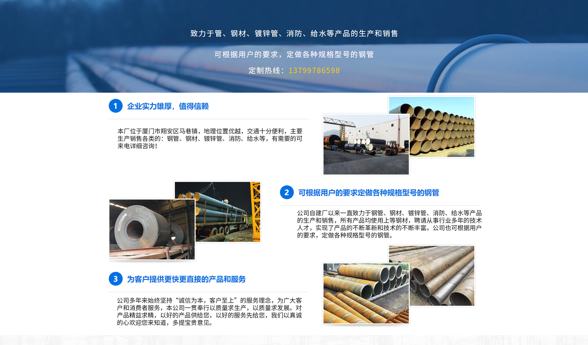 廈門方圓澤金屬材料有限公司主要生產(chǎn)銷售各類銀澤的:鋼管、鋼材、鍍鋅管、消防、給水等,產(chǎn)品被廣泛應(yīng)用于天然氣、石油、化工、電力、熱力管網(wǎng)、水源等長距離輸送管道等,公司建立起了產(chǎn)品售前、售后服務(wù)規(guī)范,全過程滿足顧客要求,使我們的產(chǎn)品和服務(wù)深得顧客的信賴,與顧客建立起了長期合作互利關(guān)系。
